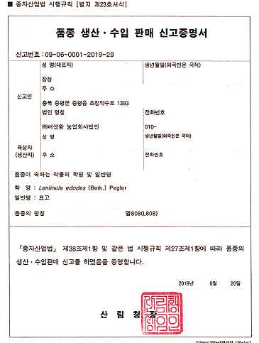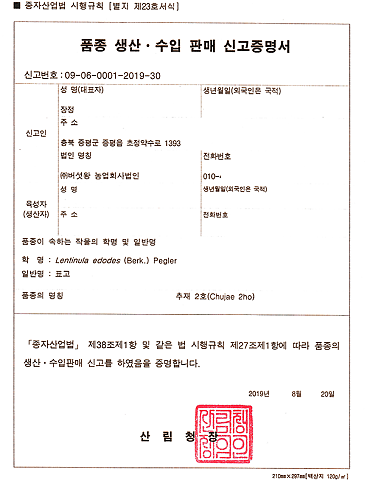 품종 생산,수입 판매 신고증