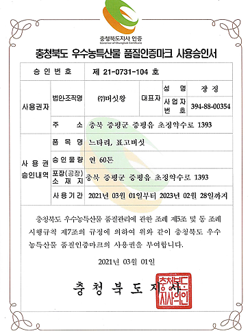 우수농특산물 품질인증마크 사용승인서