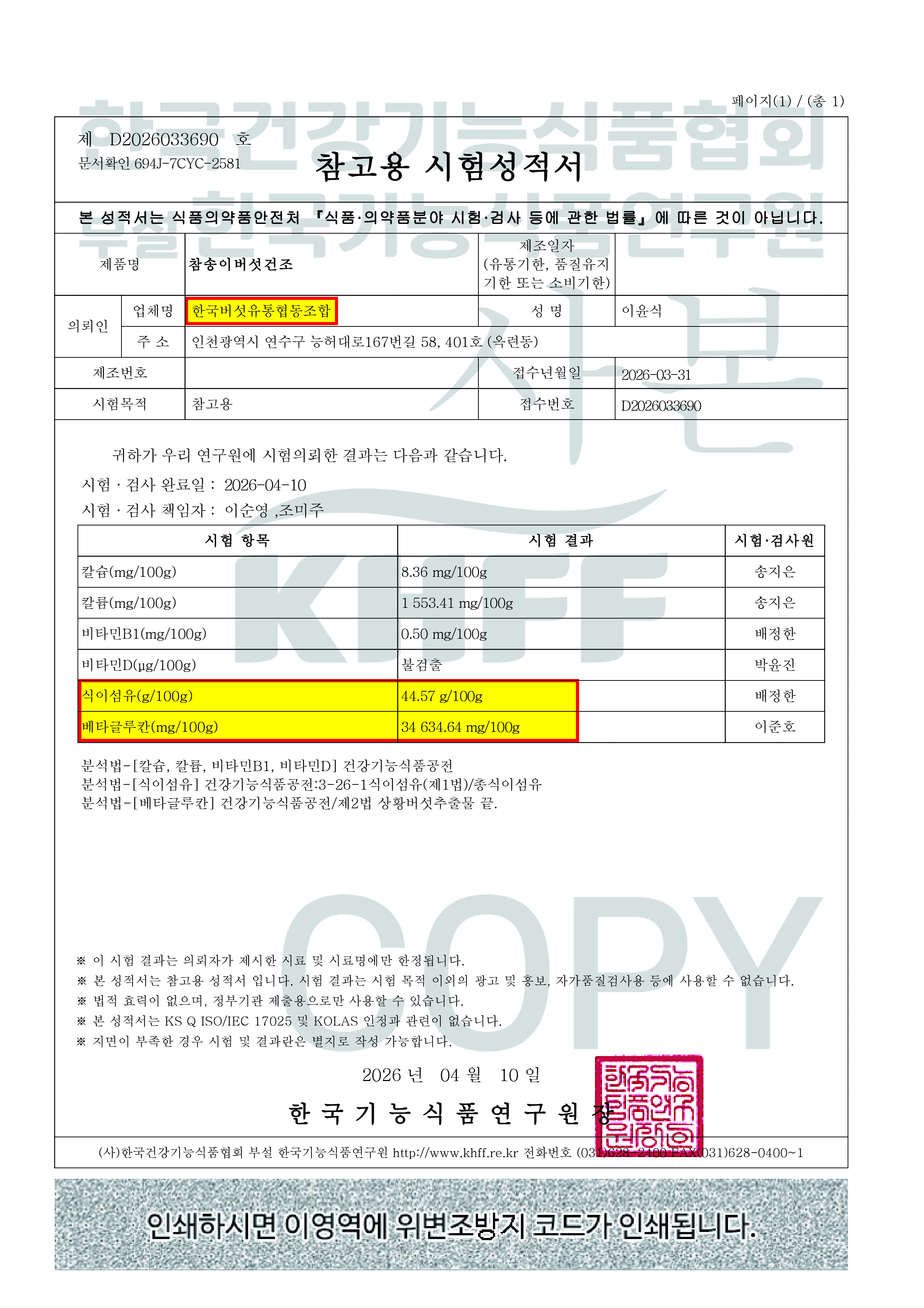 공신력 있는 시험 기관의 결과를 통해 참송이버섯의 기능성 성분 우수성이 객관적으로 입증됐습니다.