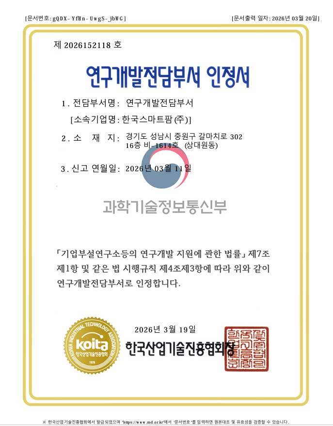 제목 연구개발전담부서 인정서 취득 7 04.03 13:11 관리자 0 7 04.03 13:11 당사는 최근 연구개발 활동의 체계적 관리와 기술 혁신 역량 강화를 인정받아 ‘연구개발전담부서 인정서’를 공식 취득하였습니다. 이번 인정서는 당사의 연구개발 조직과 프로세스가 정부 기준에 부합하며, 지속적인 기술 개발과 신제품 혁신 능력을 보유하고 있음을 입증하는 중요한 성과입니다.