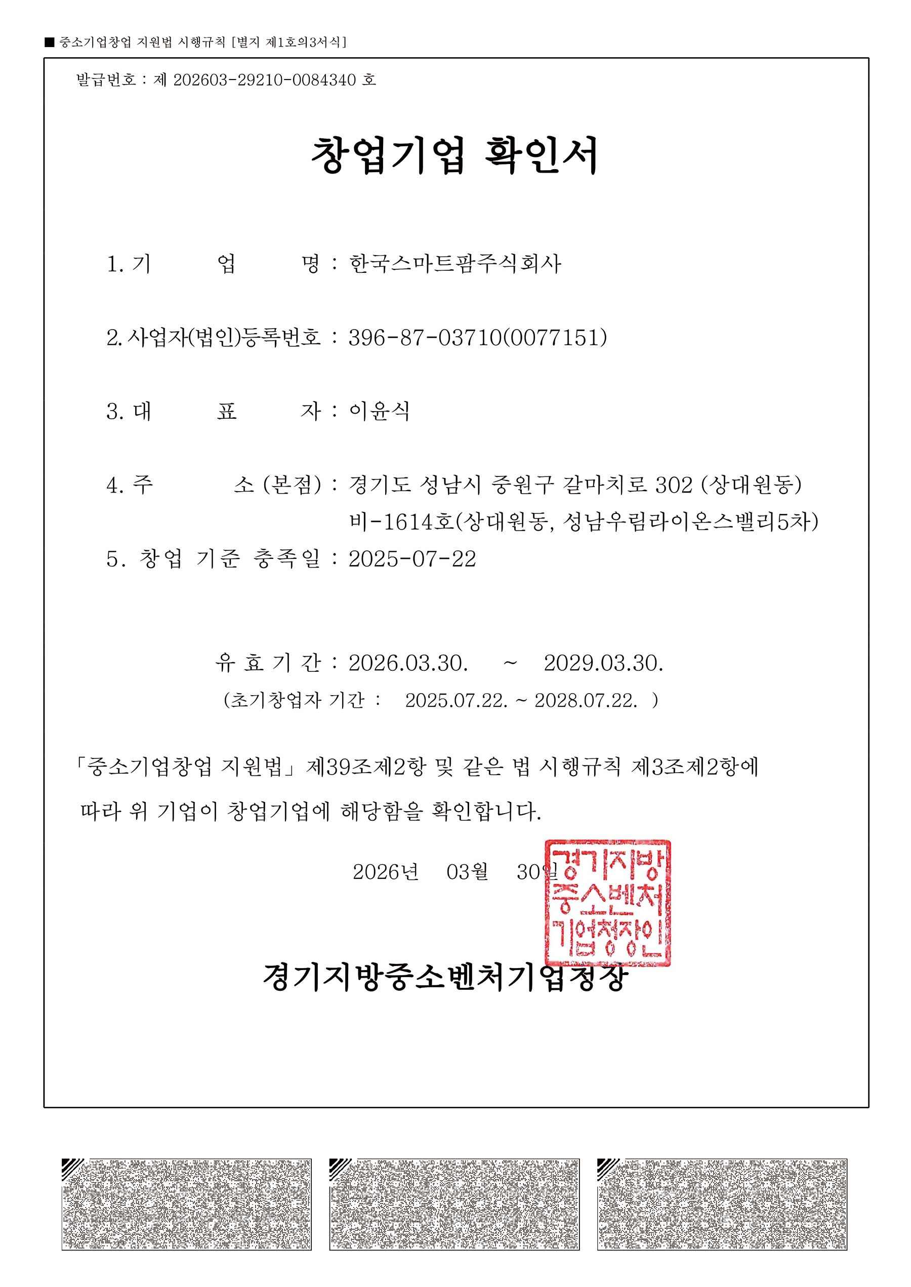 제목 창업기업확인서 발급 완료 8 04.03 13:33 관리자 0 8 04.03 13:33 당사는 최근 창업기업확인서를 공식 발급받았다고 밝혔다. 이번 확인서는 당사가 창업 초기 기업으로서 혁신적 사업 아이디어와 성장 잠재력을 갖춘 기업임을 정부 기관으로부터 인정받았음을 의미한다.창업기업확인서는 창업 지원 정책 참여, 연구개발 자금 지원, 세제 혜택 등 다양한 제도적 혜택과 연계될 수 있어, 당사의 사업 확장과 기술 개발에 중요한 기반이 될 것으로 기대된다.